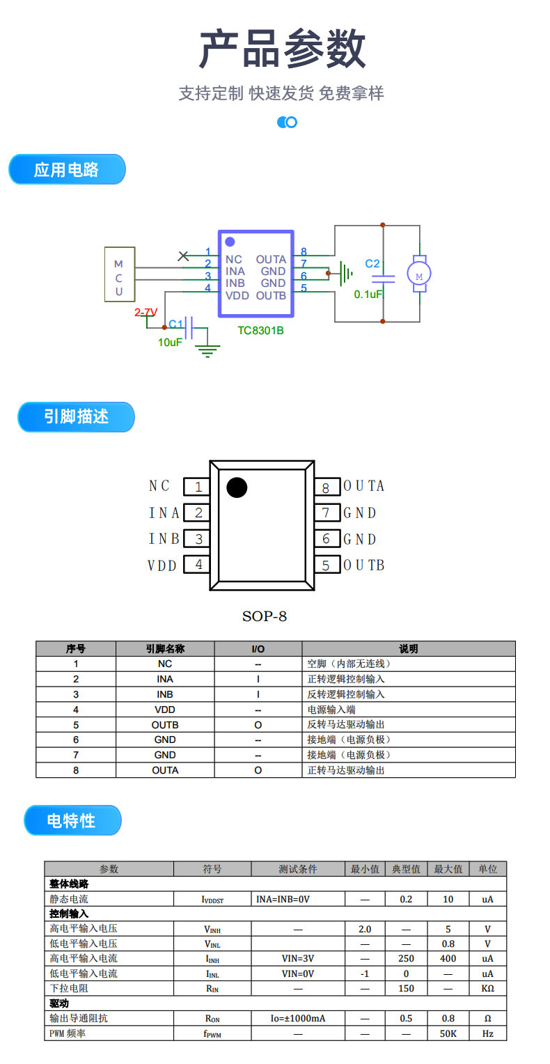1.7A 有刷直流单颗电机正反转驱动芯片TC8301B