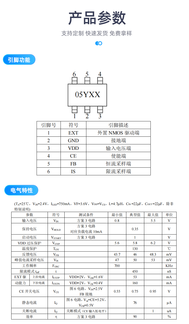 TP8305B 高效率恒流限流 WLED 驱动芯片,可调恒定电流和限定电流两种模式来 驱动白光 LED 而设计的升压型 DC/DC 变换器。