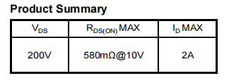 产品特性:NMOS;VDS:200V;ID:2A;RDS(ON):580mΩ